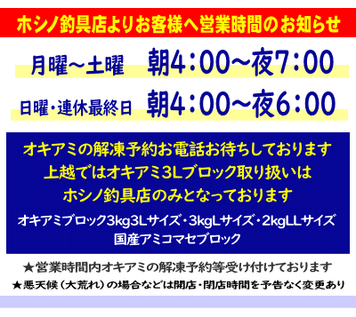 営業時間内、オキアミ解凍予約受け付けております。